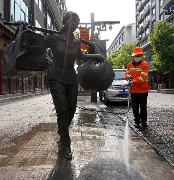 4月6日,環衛工人在武漢漢正街清洗路面。