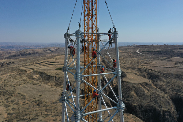 國網(wǎng)工人在蒙西—晉中特高壓交流工程線路工程(內(nèi)蒙古段)12號鐵塔施工現(xiàn)場作業(yè)(無人機照片)。該工程是華北“兩橫三縱”特高壓交流主網(wǎng)架的重要組成部分。記者 徐欽 攝