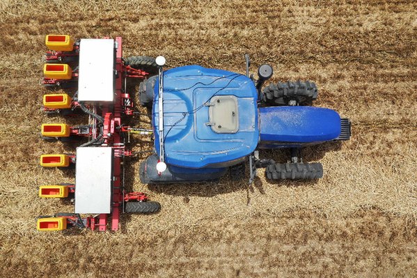 在河南省鄧州市小楊營鎮安眾村,加裝有北斗導航系統的拖拉機在無人駕駛狀態下播種。