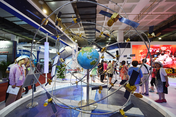 圖為此前參觀者在第二十屆中國北京國際科技產業博覽會上參觀展出的北斗衛星導航系統模型。記者 鞠煥宗 攝