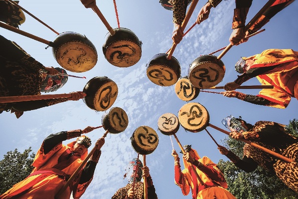 巴象鼓舞是閬中土著巴人由巫舞演化而來的狩獵舞和戰(zhàn)舞,在當?shù)孛耖g代代傳承,至今頑強地保留著巴人的基因——彪悍粗獷、能歌善舞、勇猛尚武……正如古籍所載,“閬中有渝水,賨人居左右,銳氣善舞”“周武王伐紂,實得巴蜀之師……巴師勇銳,歌舞以凌殷人,前徒倒戈。故世稱之曰‘武王伐紂,前歌后舞’也。”