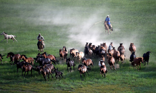 牧民在錫林浩特市寶力根蘇木的草原上套馬。記者 任軍川 攝