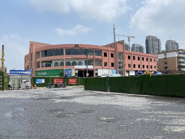 圖為南京地鐵1號線北延工程燕子磯站施工現場,三層建筑為未拆除的北橋市場。記者 程子龍 攝