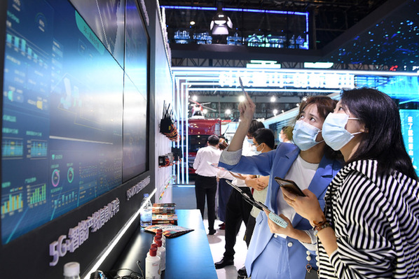 ????在2021智博會現場,工作人員(前左)向觀眾介紹“5G+智能制造”的應用。(資料照片)新華社記者 唐奕 攝