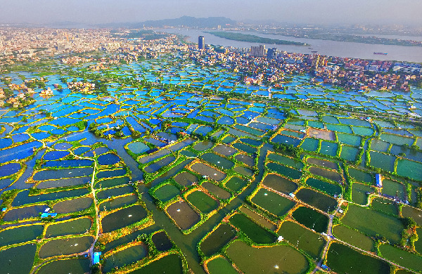 南海九江鎮(zhèn)水網(wǎng)交錯,高空俯瞰下魚塘成片,或是村落林立,或是公路貫穿,構(gòu)成一幅幅富有特色的水鄉(xiāng)人家、桑基魚塘的田園畫面。(南海區(qū)委宣傳部供圖)