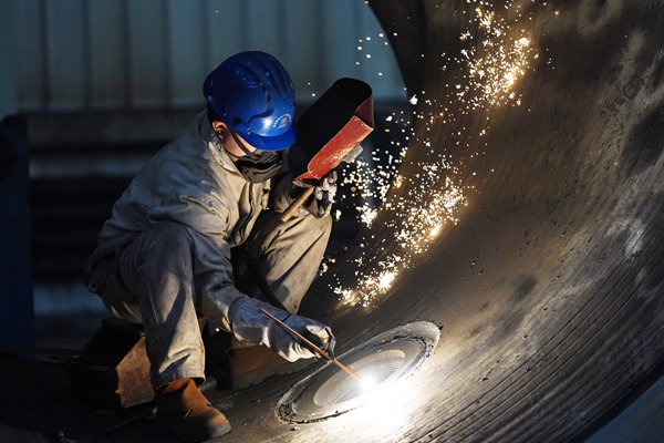 工人在哈電集團(tuán)哈爾濱鍋爐廠有限責(zé)任公司生產(chǎn)車間作業(yè)。記者 王建威 攝