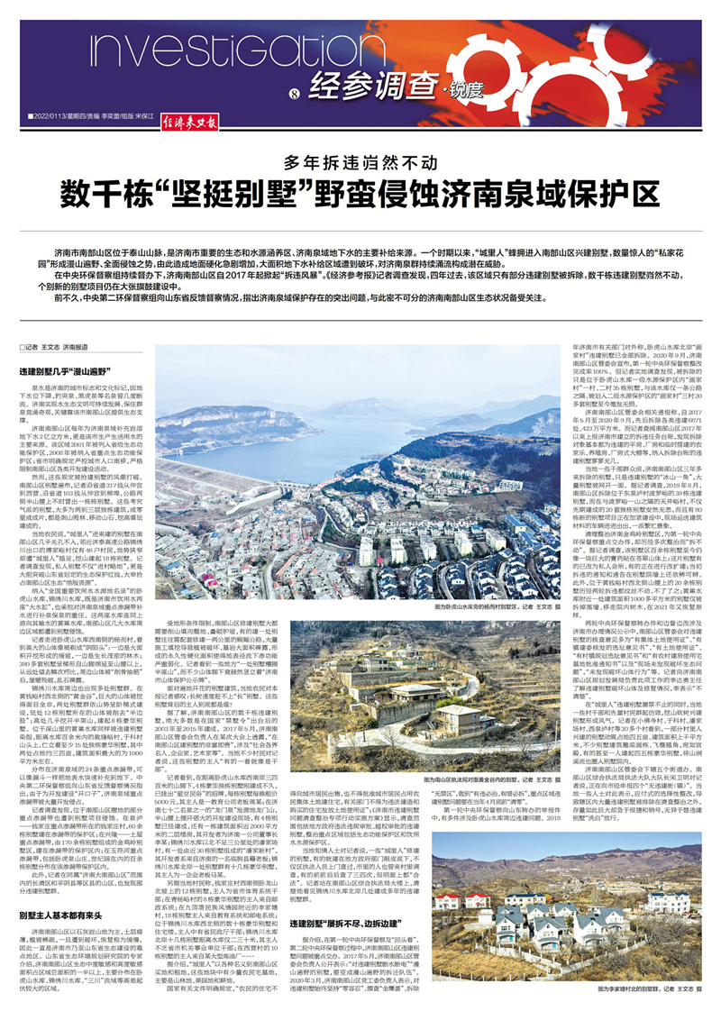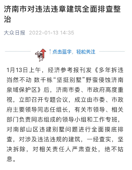 ? 1月13日下午,大眾日報微信公眾號發布《濟南市對違法違章建筑全面排查整治》一文。文章稱:1月13日上午,經濟參考報刊發《多年拆違巋然不動 數千棟“堅挺別墅”野蠻侵蝕濟南泉域保護區》后,濟南市委、市政府高度重視,立即召開專題會議,成立由市委、市政府主要領導同志任組長,有關市領導、相關部門負責同志組成的領導小組和工作專班,對南部山區違建別墅問題進行全面摸底排查,對涉及違法違規的建筑,一經查實,堅決拆除,對相關責任人嚴肅查處,絕不姑息。