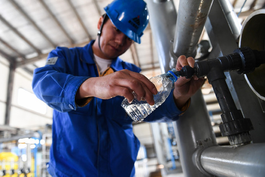 國家能源集團旗下公司廢水處理中心,一名工作人員展示經過處理后的污水。記者 劉磊 攝