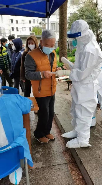 “今天有很多上網課的學生,會有些晚到的居民”,眼看到核酸篩查接近尾聲,他又和志愿者們一起商討、查看還未篩查的居民數,并做好分工,挨家挨戶去詢問,提醒居民“上午的核酸篩查馬上結束了,請趕快前往核酸點篩查!”