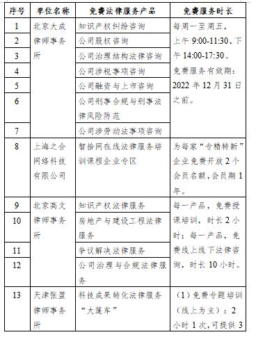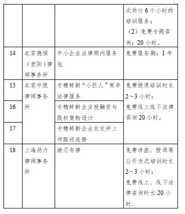 為幫助中小企業(yè)特別是“專精特新”中小企業(yè)獲得精準(zhǔn)、有效的法律服務(wù),中國中小企業(yè)發(fā)展促進(jìn)中心向法律服務(wù)機(jī)構(gòu)開展了公益服務(wù)項目征集工作。最終優(yōu)選了7家在全國或區(qū)域具有較高專業(yè)水平、較強(qiáng)社會責(zé)任意識、公益服務(wù)能力過硬的法律服務(wù)機(jī)構(gòu)提供的18項法律服務(wù)產(chǎn)品組成服務(wù)包,涵蓋公司治理、企業(yè)合規(guī)、融資上市、知識產(chǎn)權(quán)、科技成果轉(zhuǎn)化、股權(quán)稅務(wù)、勞動糾紛、爭議解決、房地產(chǎn)與建設(shè)工程、游戲產(chǎn)業(yè)法律服務(wù)等領(lǐng)域,向“專精特新”及“小巨人”企業(yè)免費(fèi)提供。服務(wù)產(chǎn)品特色突出、針對性強(qiáng),能較好地滿足專精特新及“小巨人”企業(yè)實(shí)際法律需求。