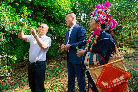 △老班章茶王地采摘現(xiàn)場(chǎng)(左一為云南省農(nóng)業(yè)科學(xué)院茶葉研究所所長(zhǎng)何青元、中間為八馬茶業(yè)董事、副總經(jīng)理何磊,右一為老班章茶王茶后樹守護(hù)人楊紅花)