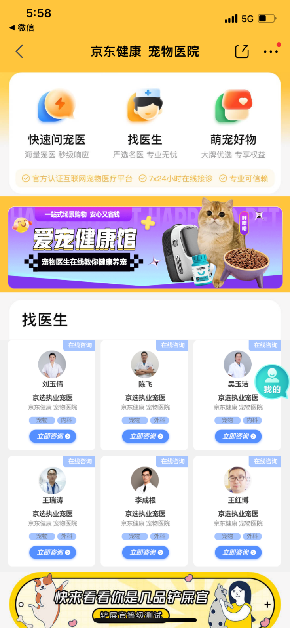 目前,京東健康寵物醫院提供包括犬、貓、全科等七個科室的7×24免費在線健康咨詢服務,截至2021年底,已有超過5000位寵物醫生在線服務,用戶能夠享受圖文咨詢和視頻咨詢兩種服務方式。寵物主只需要打開京東APP,搜索“寵物醫院”,執業醫生就會提供防疫指導和急癥處理,包括寵物居家情緒疏導指引、寵物居家隔離慢病管理、寵物突發健康狀況在線急救等。