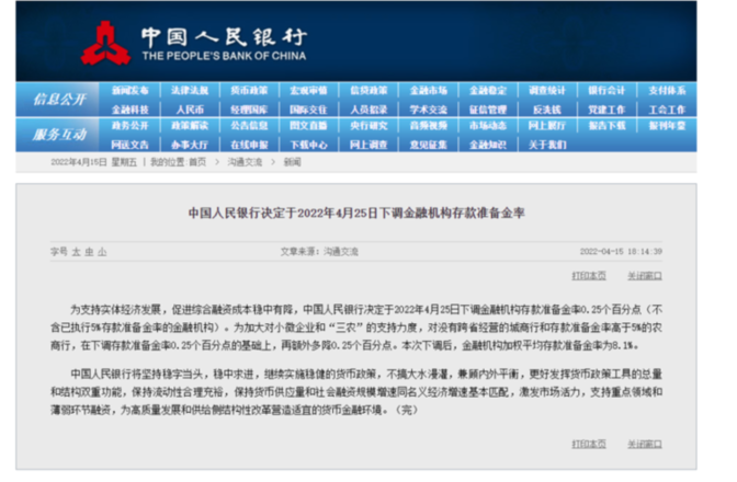 為支持實體經(jīng)濟(jì)發(fā)展,促進(jìn)綜合融資成本穩(wěn)中有降,中國人民銀行決定于2022年4月25日下調(diào)金融機(jī)構(gòu)存款準(zhǔn)備金率0.25個百分點(不含已執(zhí)行5%存款準(zhǔn)備金率的金融機(jī)構(gòu))。為加大對小微企業(yè)和“三農(nóng)”的支持力度,對沒有跨省經(jīng)營的城商行和存款準(zhǔn)備金率高于5%的農(nóng)商行,在下調(diào)存款準(zhǔn)備金率0.25個百分點的基礎(chǔ)上,再額外多降0.25個百分點。本次下調(diào)后,金融機(jī)構(gòu)加權(quán)平均存款準(zhǔn)備金率為8.1%。