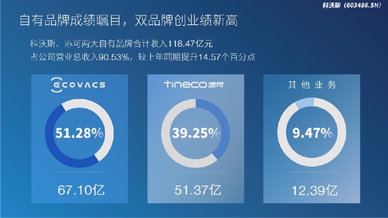 盈利能力顯著增強(qiáng)的背后,離不開其自主品牌業(yè)務(wù)“量?jī)r(jià)齊升”的靚麗表現(xiàn),2021年科沃斯兩大自主品牌合計(jì)業(yè)務(wù)收入占比達(dá)90.53%,同比提升14.57個(gè)百分點(diǎn),兩大業(yè)務(wù)也繼續(xù)在各自領(lǐng)域中鞏固行業(yè)龍頭地位。