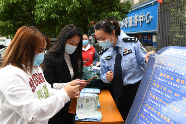 5月16日,貴州省貴陽市云巖區八鴿巖街道干部和民警為群眾講解防范電信詐騙知識。5月17日世界電信日到來之際,各地開展多種活動,迎接世界電信日。