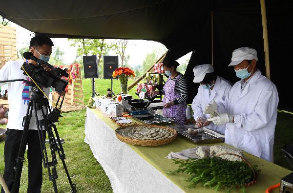圖為近日安徽省肥西縣柿樹崗鄉村民通過“云上”直播制作當地特色美食。新華社記者 劉軍喜 攝
