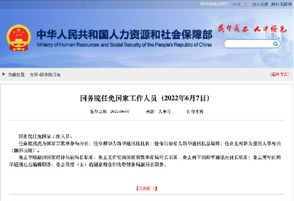 據人社部官網7日消息,國務院任免國家工作人員: