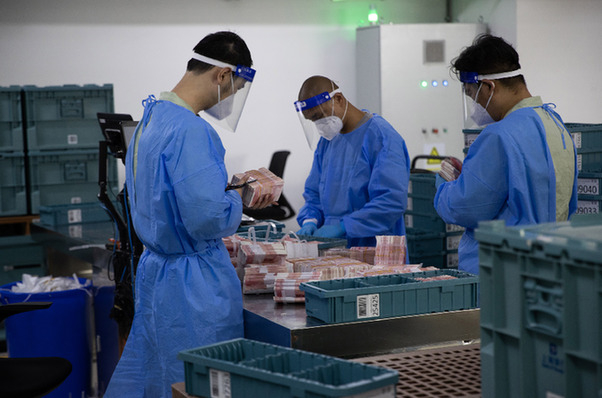 在上海銀行現金中心智能金庫,工作人員對現金進行預處理,將現金放進標準化容器,以便由帶有消毒模塊的大型清分機進行自動清分作業。