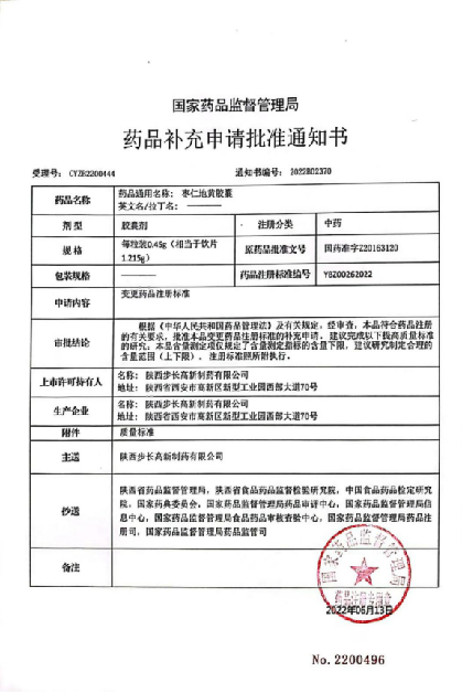公司于2021年確定棗仁地黃膠囊黃芩苷質(zhì)量標(biāo)準(zhǔn)修訂研究,擬定質(zhì)量標(biāo)準(zhǔn)通過了陜西省食品藥品監(jiān)督檢驗研究院技術(shù)復(fù)核,于2022年04月向國家局提交變更注冊標(biāo)準(zhǔn)的申請,近日已取得國家藥品監(jiān)督管理局藥品補(bǔ)充申請批準(zhǔn)通知書。