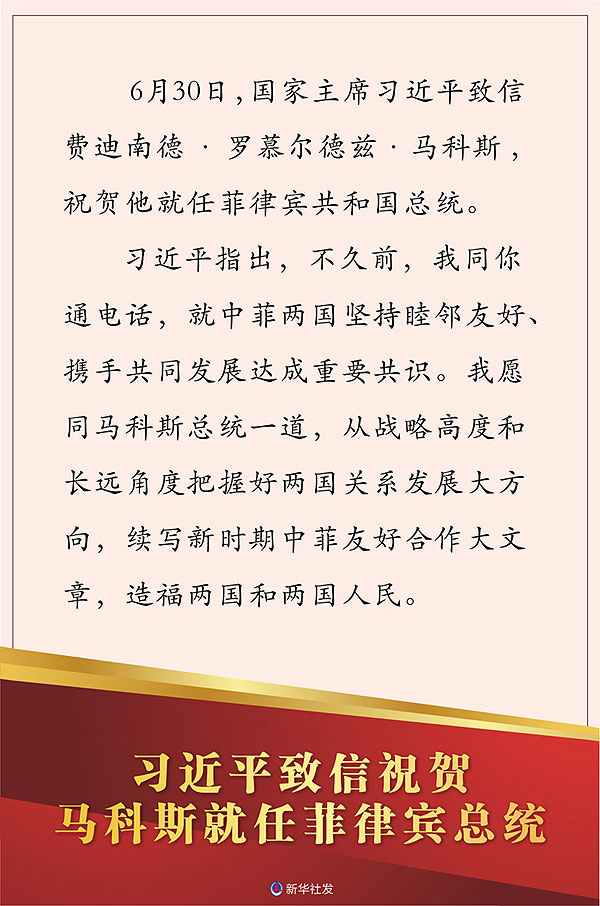 新華社北京6月30日電 6月30日,國家主席習(xí)近平致信費迪南德·羅慕爾德茲·馬科斯,祝賀他就任菲律賓共和國總統(tǒng)。