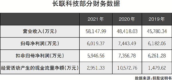 財務(wù)數(shù)據(jù)顯示,報告期內(nèi),長聯(lián)科技營業(yè)收入保持穩(wěn)定增長,各期分別為45780.34萬元、48418.03萬元和58147.99萬元。據(jù)長聯(lián)科技披露,公司于2015年在新三板公開轉(zhuǎn)讓并于2017年申請摘牌,2015年與2016年營業(yè)收入分別為21321.19萬元、25828.06萬元。相比新三板時期,公司報告期內(nèi)營收規(guī)模有所擴大。