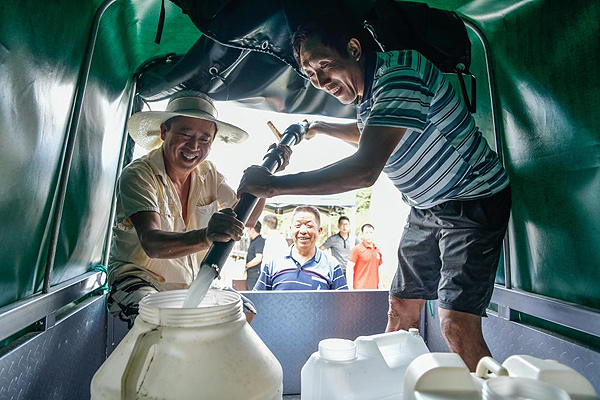 記者在現場看到,蘇建松開車從水源點拉了兩大桶水送到村里,周邊的農戶高興地提著水桶前來接水。他說,自己平時在鎮上經營夜宵店,白天時間比較寬裕,最近看到很多人送水十分辛苦,想來分擔一下,能夠幫助大家自己也感覺很開心。