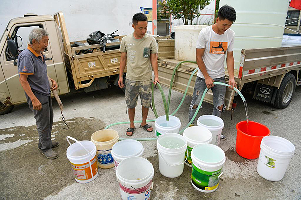 8月26日,在沿河縣譙家鎮譙家鋪村,志愿者在給缺水的村民送水。新華社記者楊文斌 攝