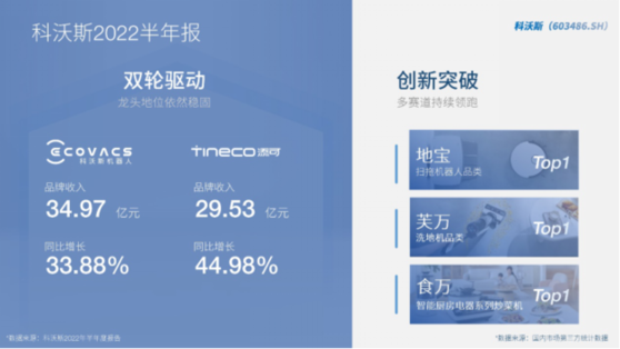 2022年8月26日晚間,科沃斯(603486.SH)發(fā)布2022年半年報。報告顯示,作為科沃斯旗下高端智能生活電器新銳品牌TINECO添可,實現(xiàn)銷售收入29.53億元人民幣,占全部收入的43.28%,較上年同期增長44.98%。