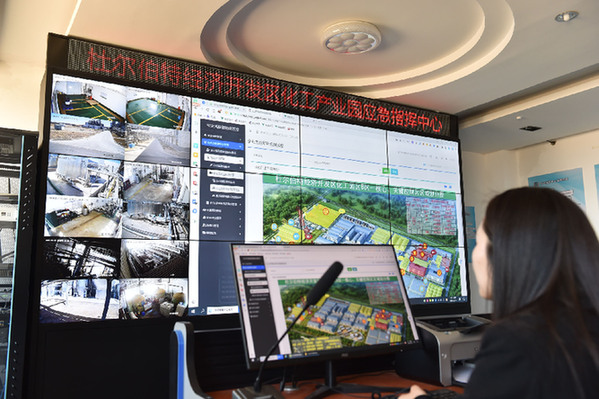 智能化手段正在助力園區對排放進行精準管控。在園區化工產業園應急指揮中心,化工園區管理辦公室主任孫宇熙輕點鼠標,便可查看園區內化工企業的排放情況,地下水、地表水、廢水、廢氣等指標一目了然,實現園區應急、消防、環保、車輛人員等數字化管理。“全縣從各部門遴選7名化工專業人才到園區工作,通過云管理平臺,幫助園區進行能耗、評估、運營等的數據監測以及入駐企業創新指數等的跟蹤監測。”孫宇熙說。