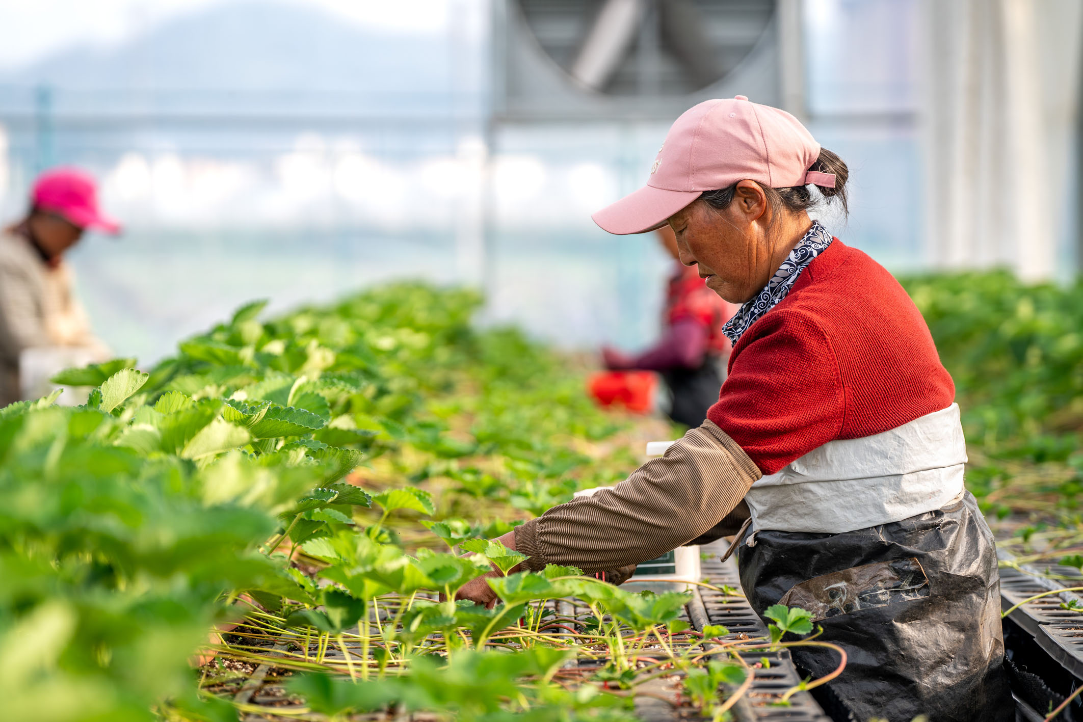 5月15日,工人在巧家縣馬樹鎮草莓種植基地育苗。近年來,云南省昭通市巧家縣馬樹鎮利用氣候、地理條件優勢,大力發展草莓規模化種植,已完成草莓交易中心、育苗基地、深加工廠等項目建設,形成了集生產、加工、銷售于一體的產業鏈條。目前,馬樹鎮夏季草莓種植面積達2萬畝,年產量4萬噸,總產值約6億元。